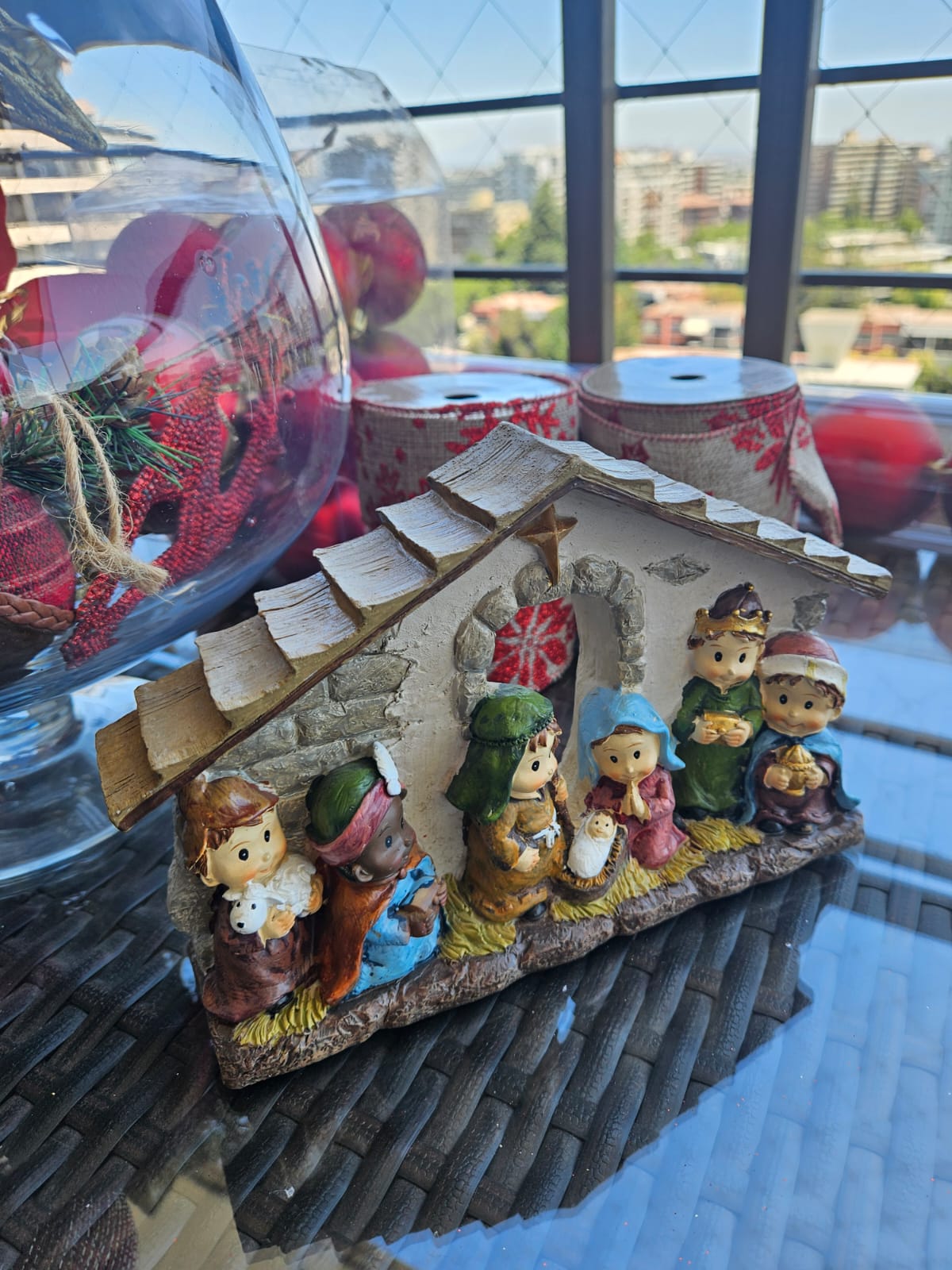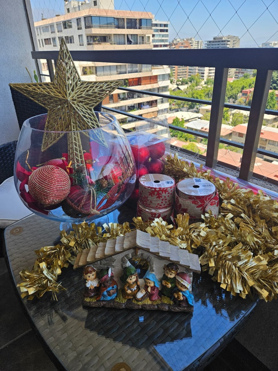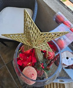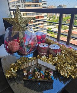 Incluye: 4 cintas D+design (5×270 cm), 1 pack de 9 esferas grandes Attimo, 1 pack de 12 esferas medianas Krea, 5 esferas individuales, 8 rositas, 2 guirnaldas doradas, 1 pesebre Holiday Time, 1 estrella dorada.