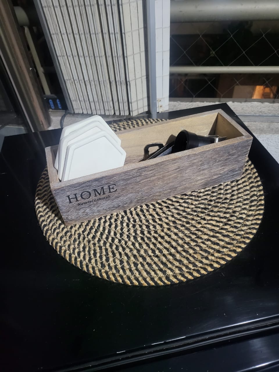 – 1 caja de madera natural 30×9 cm incluye 3 posavasos de cerámica