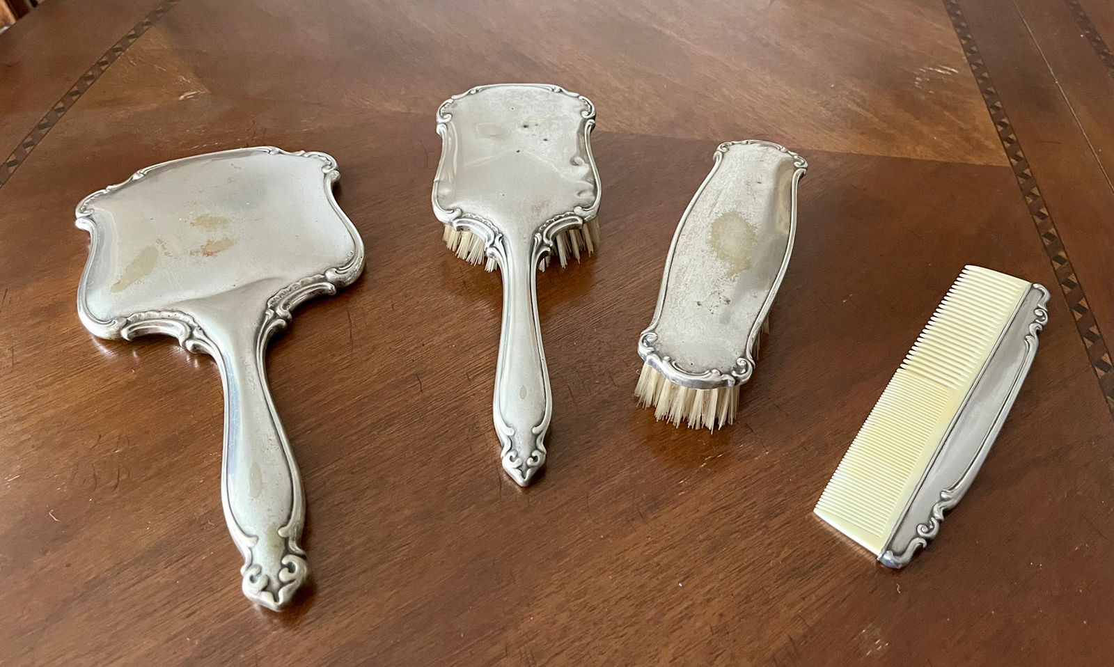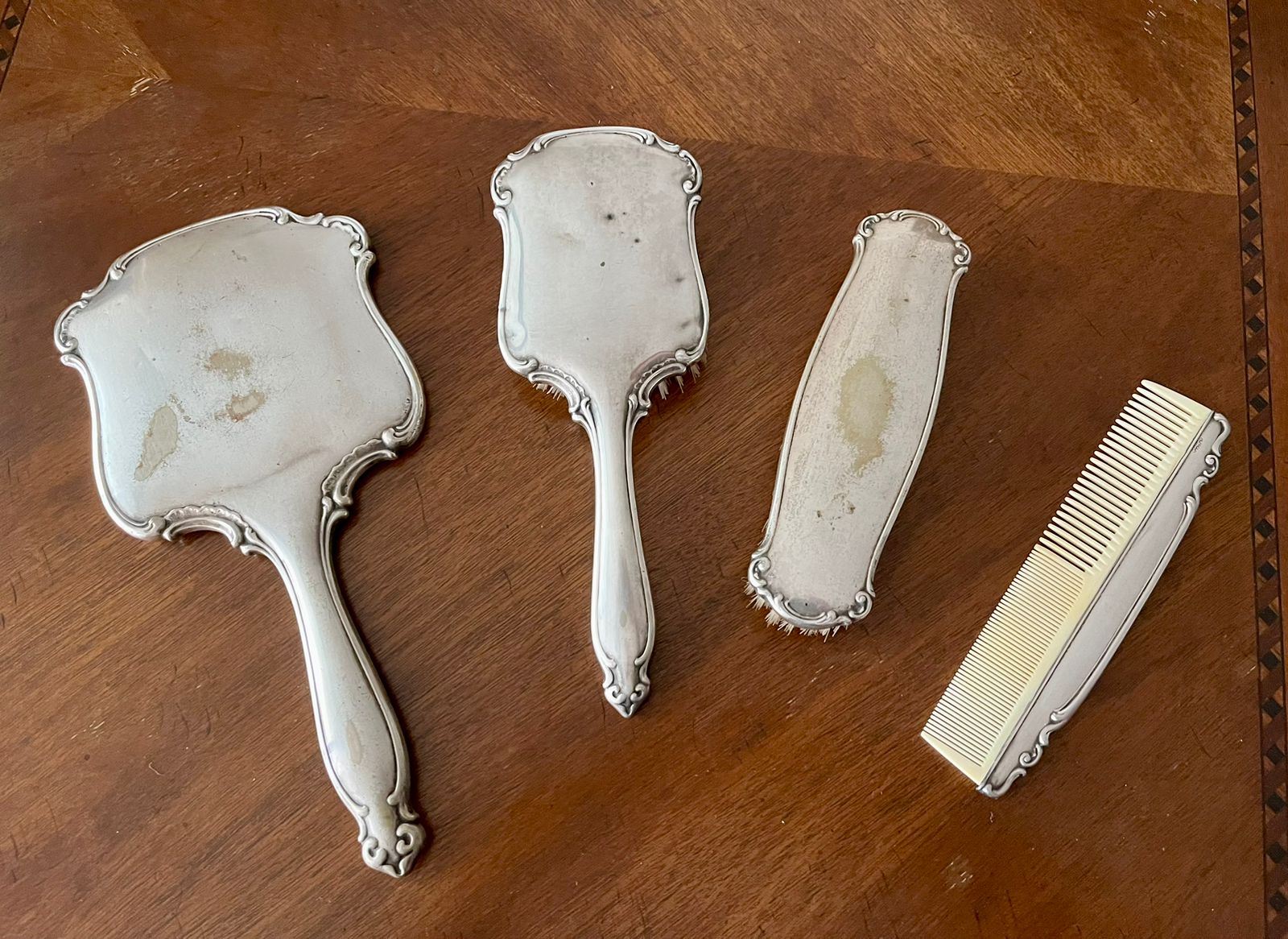 Incluye espejo biselado, cepillo, peineta y escobilla