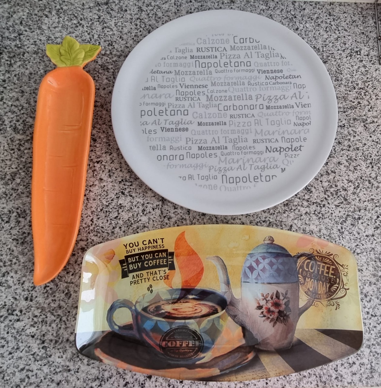 Incluye plato en forma de zanahoria, plato para pizza y plato ovalado