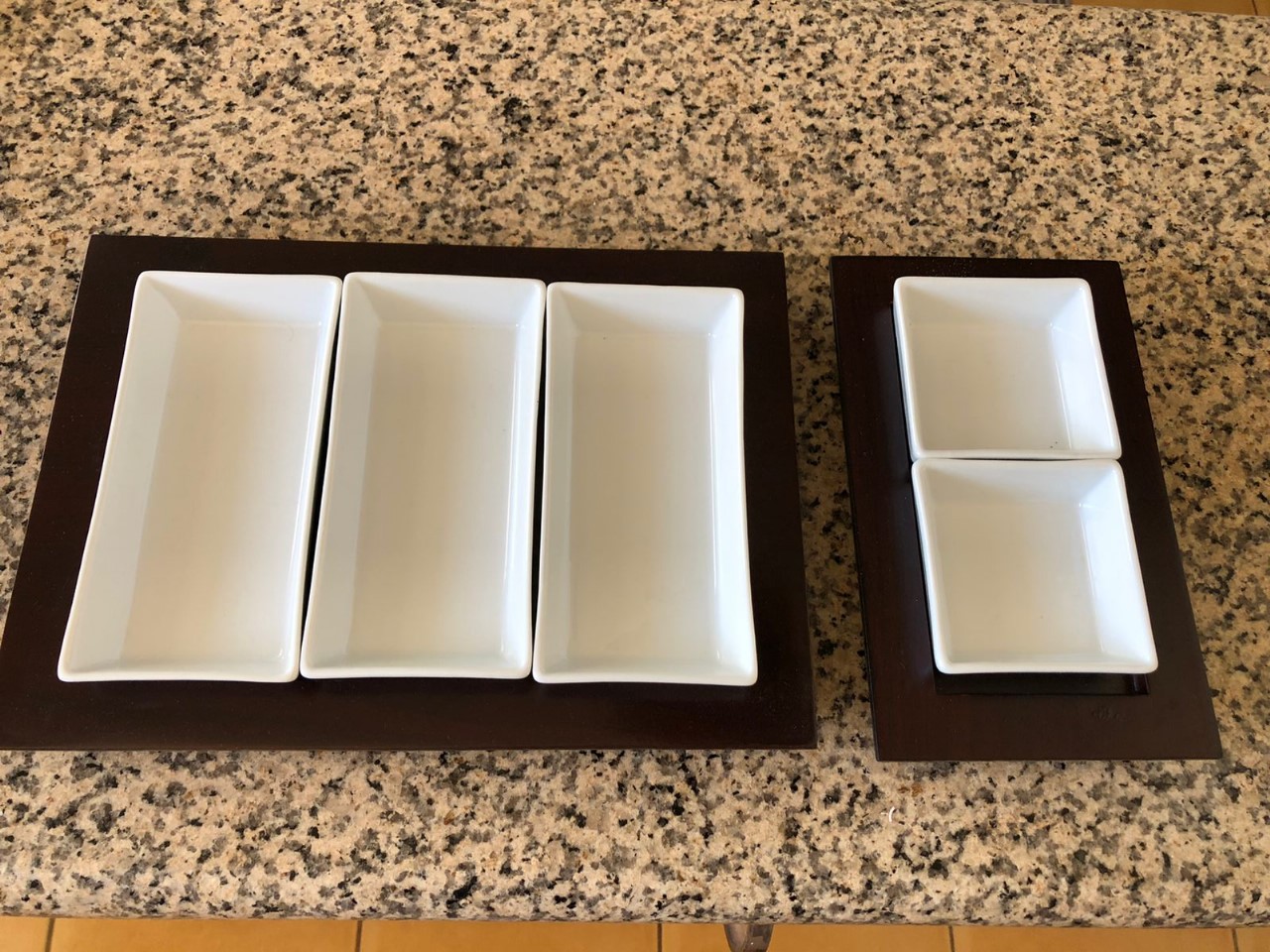 Incluye: 1 bandeja de madera + pocillos rectangulares y 1 bandeja de madera + 2 pocillos cuadrados