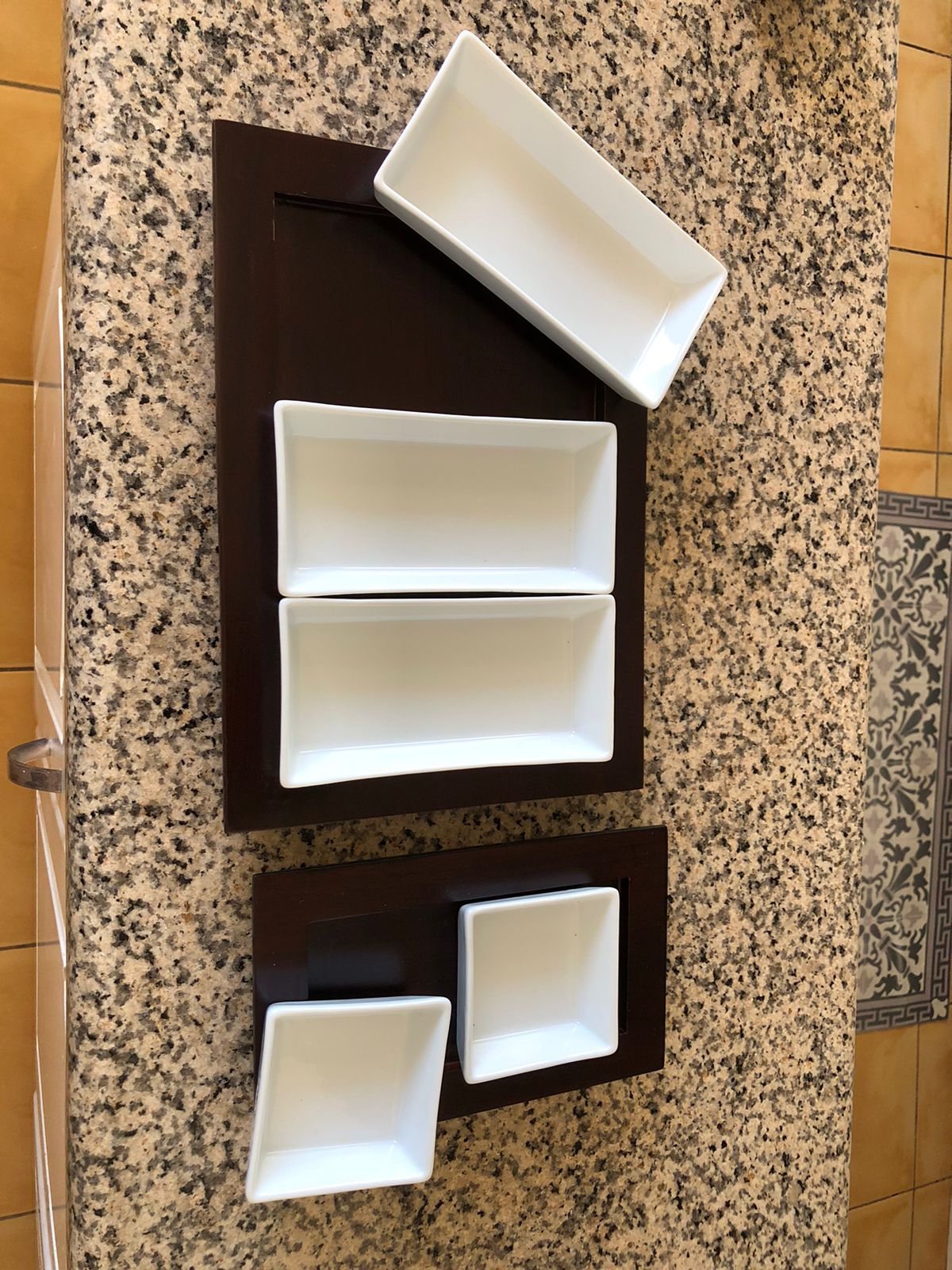 Etiquetas: artículos nuevos, bandeja de madera, bandeja pequeña, bandeja rectangular, fuentes madera, fuentes nuevas, fuentes porcelana, pocillos cuadrados, pocillos rectangulares, set de 2 bandejas, set de madera, set de porcelana, Set fuentes porcelana y madera S&P, set-fuentes, utensilios de porcelana