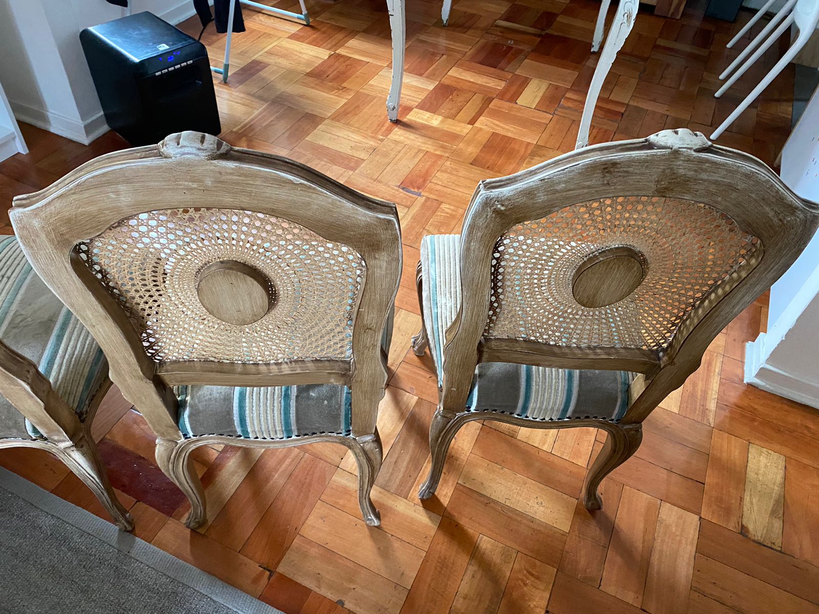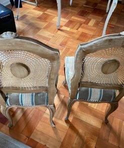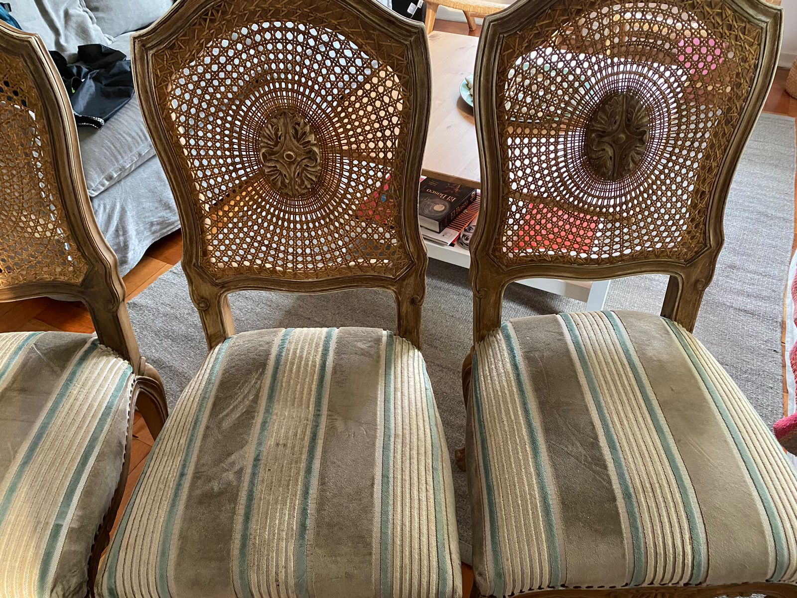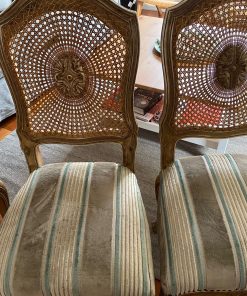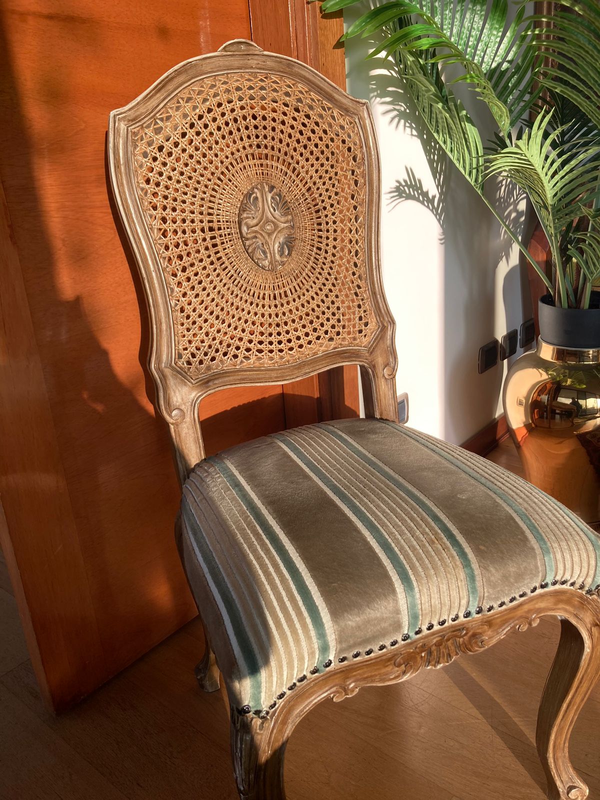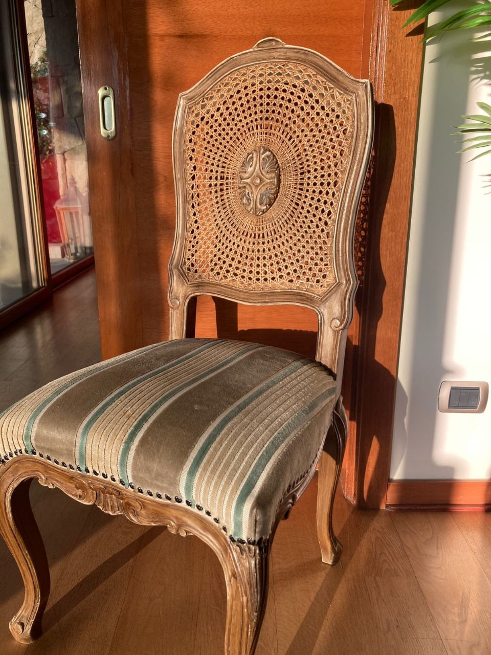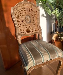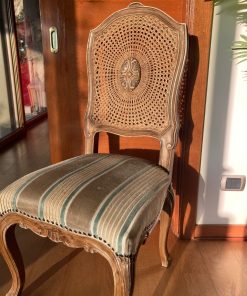 Tapizado original de felpa, respaldo de junco y patas con un detallado tallado