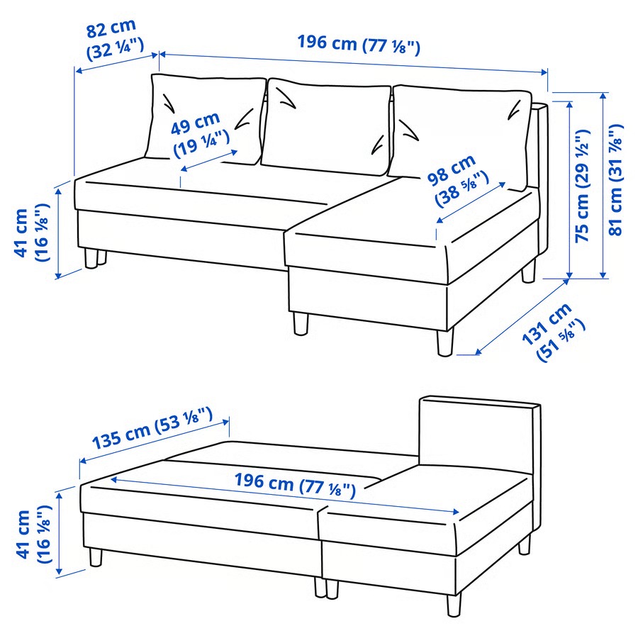 Medidas 196 x 82 x 75 cm, L: 131 cm largo, extendido 196 x 135 x 41 cm